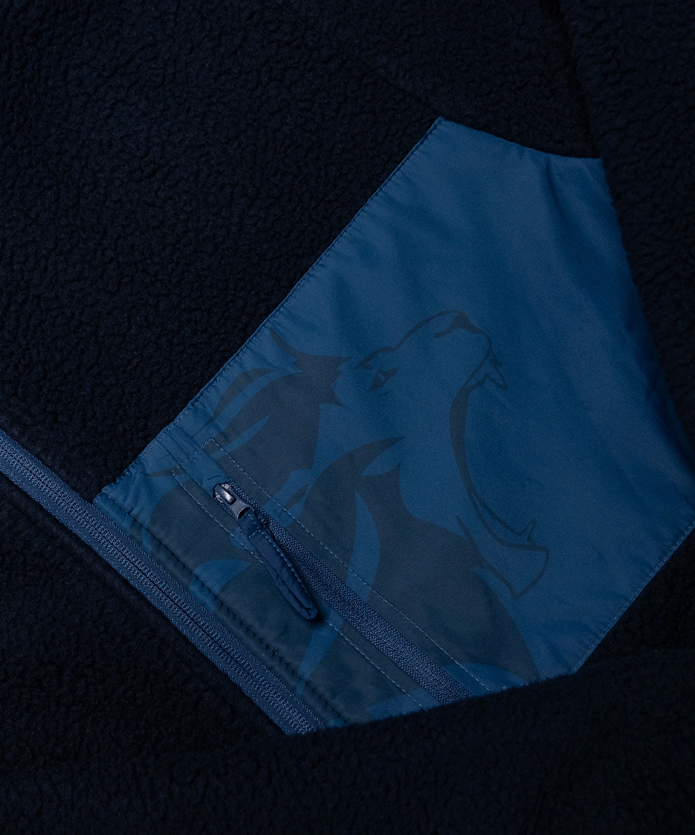 Diese dunkelblaue Fleece-Jacke kombiniert angenehme Wärme mit klarer Löwen-Identität. Der hoch geschnittene Stehkragen schützt zuverlässig vor Wind und Kälte und macht die Jacke zum idealen Begleiter für Training, Spieltage oder den Alltag.