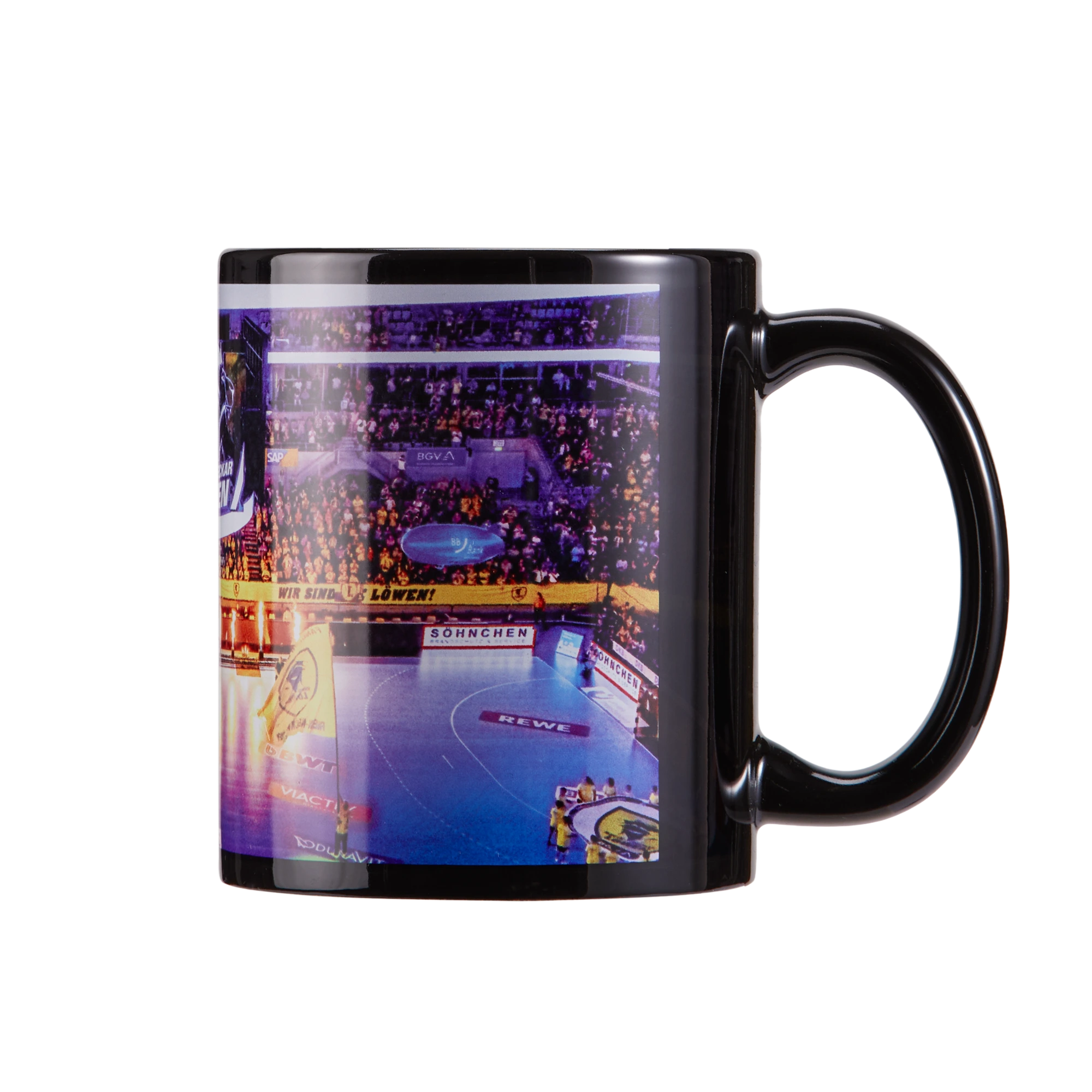 Die tiefschwarze, glänzende Oberfläche verleiht der Tasse einen modernen Look, während das rundumlaufende Fotomotiv echte Gänsehaut-Momente aus der SAP Arena direkt in deine Küche bringt. Egal ob Kaffee, Tee oder heißer Kakao: Dieser Becher sorgt bei jedem Schluck für echtes Löwen-Feeling.